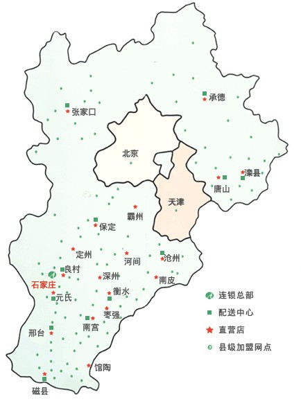 河北省農(nóng)業(yè)生產(chǎn)資料集團(tuán)有限公司十分重視市場(chǎng)營(yíng)銷(xiāo)網(wǎng)絡(luò)建設(shè) , 充分利用供銷(xiāo)社內(nèi)外資源,用現(xiàn)代流通方式改造傳統(tǒng)經(jīng)營(yíng)網(wǎng)絡(luò),大力發(fā)展農(nóng)資連鎖經(jīng)營(yíng)。自1998年開(kāi)始在全省及周邊省份組建分公司,2002年發(fā)展縣鄉(xiāng)分銷(xiāo)網(wǎng)點(diǎn), 2005年啟動(dòng)以“河北農(nóng)資豐澤苑”為統(tǒng)一品牌的農(nóng)資連鎖經(jīng)營(yíng)網(wǎng)絡(luò)工程,通過(guò)大力實(shí)施農(nóng)資配送中心建設(shè)、終端網(wǎng)絡(luò)體系升級(jí)改造建設(shè)、農(nóng)化服務(wù)體系建設(shè)和農(nóng)資信息服務(wù)體系建設(shè),已經(jīng)構(gòu)建起以省農(nóng)資公司為龍頭,以區(qū)域配送中心為骨干,以縣市分銷(xiāo)中心為依托,以鄉(xiāng)村農(nóng)資連鎖店為基礎(chǔ),覆蓋全省、輻射周邊、上下貫通、流通有序的現(xiàn)代農(nóng)資經(jīng)營(yíng)服務(wù)網(wǎng)絡(luò)體系。目前,區(qū)域配送中心16個(gè),縣級(jí)分銷(xiāo)(配送)中心156個(gè),鄉(xiāng)村加盟(直營(yíng))店3000多家。