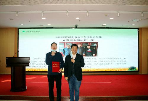 李平現(xiàn)(右)為農(nóng)資事業(yè)部化肥一部頒發(fā)“2020年度先進集體”榮譽證書